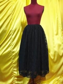 バッスルレース付きスカラップレースロングスカート:黒バラ柄レース