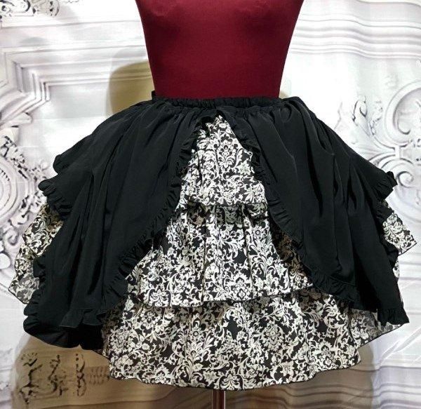 パ二エ入り3段スカート +タック変形スカート:黒×黒地白ゴシック