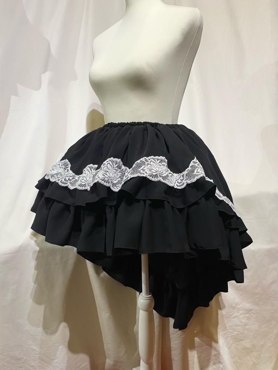 ◆受注商品◆前短・後長V字フリル重ねレース付きスカート:黒×白レース