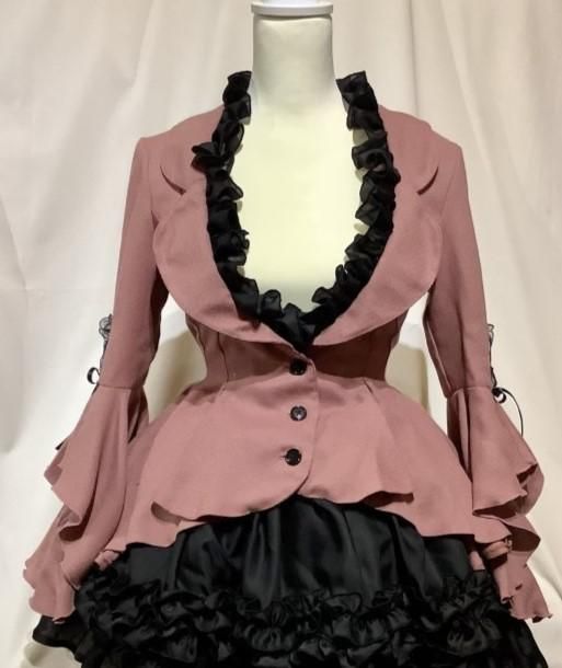 ◆受注商品◆フレアドレープテーラードジャケット:グレイッシュピンク×黒フリル×黒レース